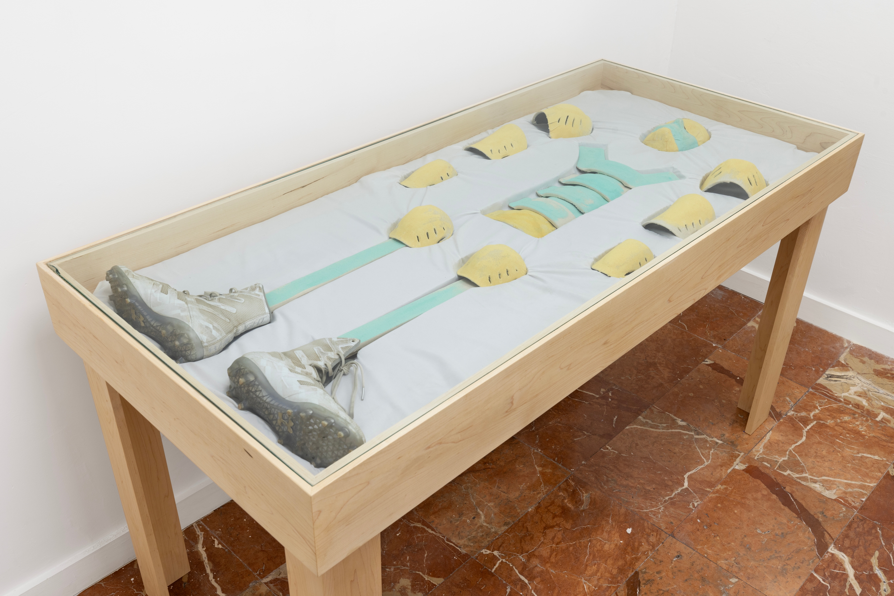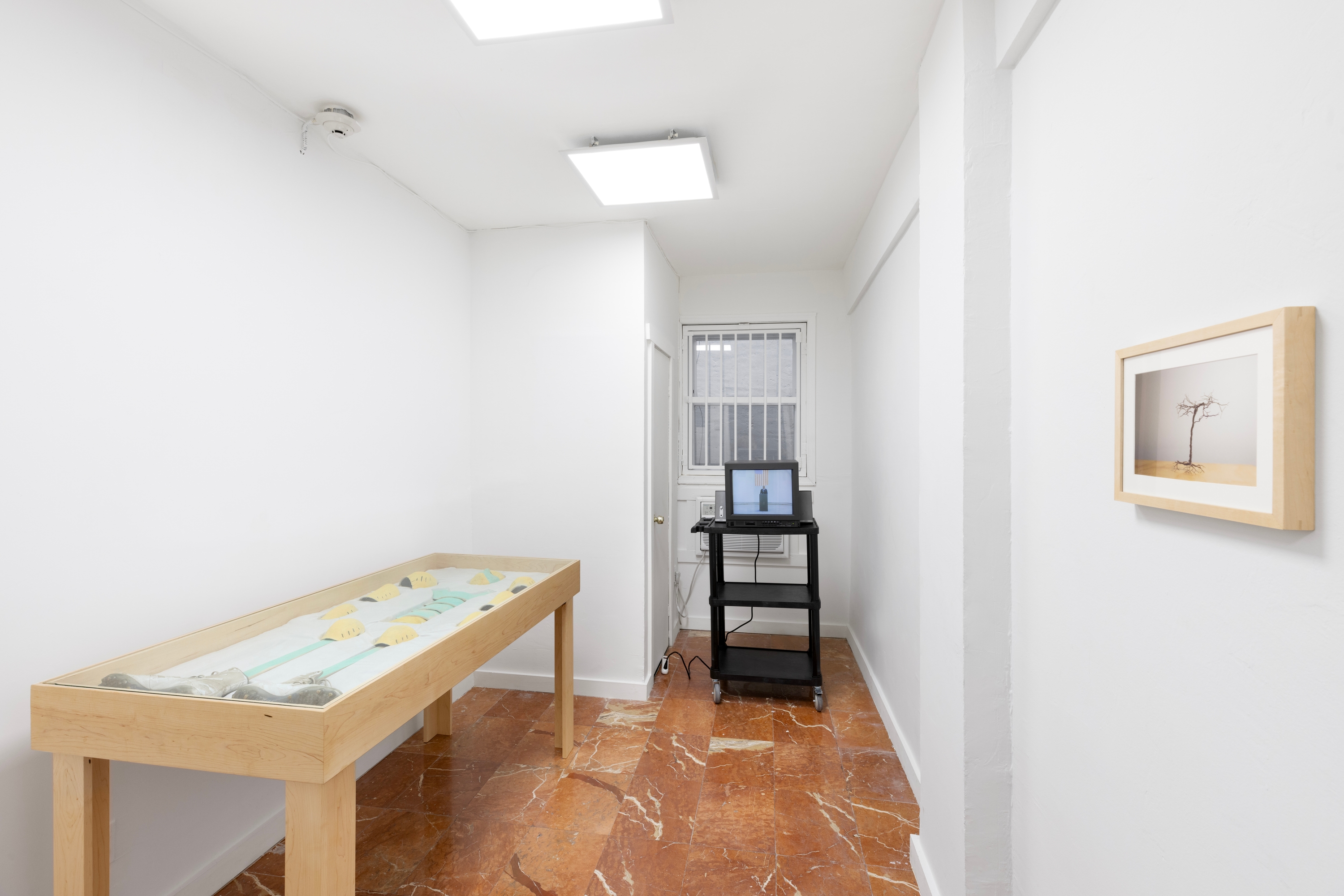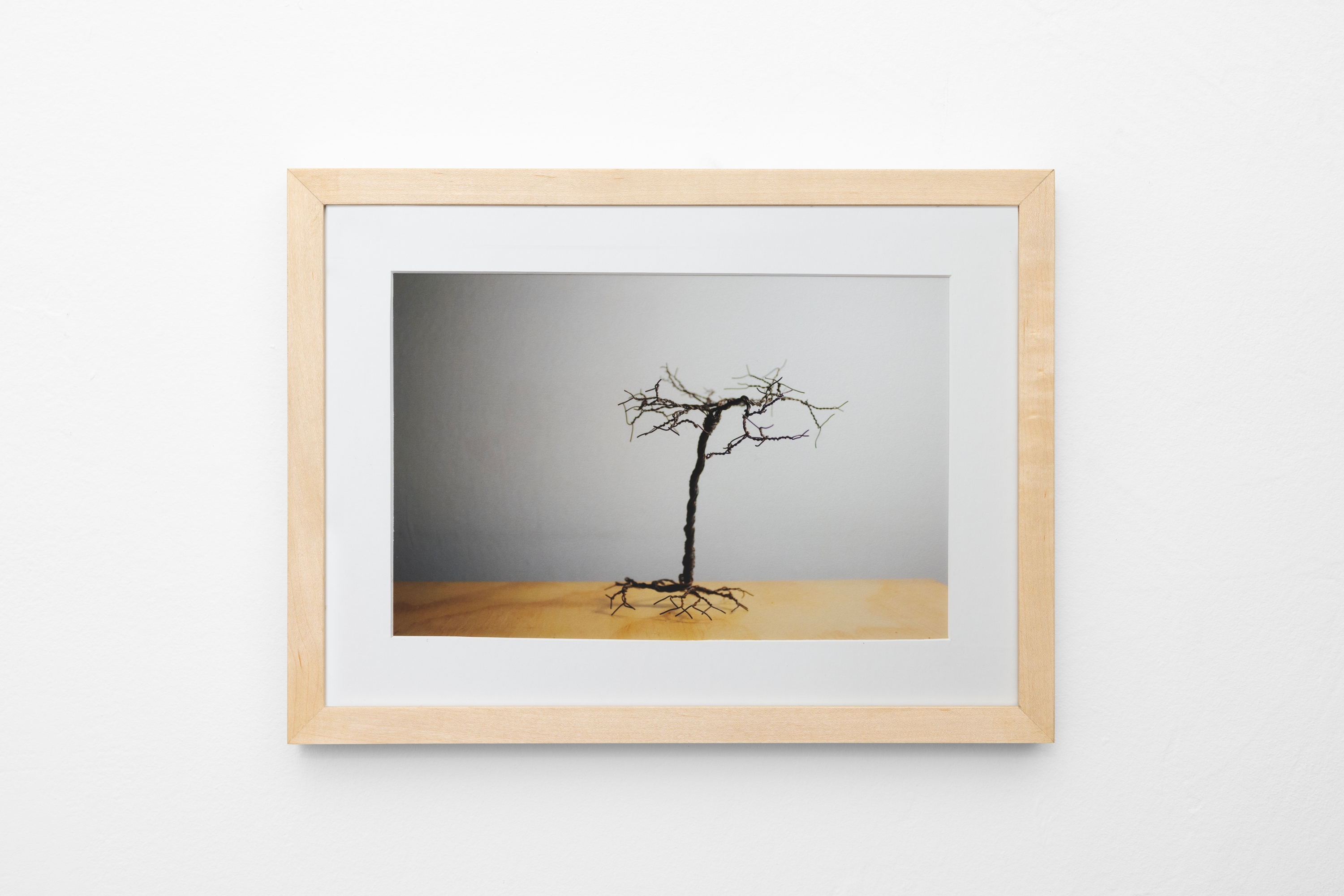 In the center, an archeological vitrine with the armor of a powerless superhero, an all-American show of brute force displayed as if seen from a historical distance. One can imagine a scholar scribbling down her translations of a long-forgotten language of desperate fortitude that recites the backlog of what, thanks to being in the past, looks like failure. An open air stage in the park, where the Mayor reads his farewell poem and invites that superhero for an eulogy. A folk song about homecoming. A tree made of wire, an image that might allude to the omnipresence and multifariousness of electricity and leads me toward an underlying question of a more general kind. Is art a particle or a wave? And if it’s either of those or both, how and when does it ever end?